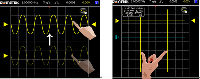 GDS-300/GDS-200系列示波器采用全觸控電容式液晶顯示器,在這個智能型手機爆炸的時代,固緯電子亦能帶領使用者進入全觸控的量測時代。使用者可以利用一根手指頭,將量測中的波形進行上下移動,也可以隨意調(diào)整觸發(fā)基準線的位置。此示波器也同時支援兩點觸控,工程師可以利用雙指進行垂直電壓準位的調(diào)整,亦可以隨心所欲地進行時間尺度的縮放,全新的觸控感以及快速的反應讓您對量測的觀感煥然一新。此外,可以利用單指在主屏幕上進行拖拉式的選單選擇,讓使用者以最直覺的方式尋找到需要量測的功能物件,也可以隨時隨地的進行圖形以及資料的存取。