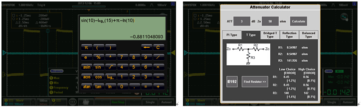 GDS-300/GDS-200系列示波器內(nèi)建多樣化的應用軟件以提供使用者極為貼心的輔助工具。在繁瑣的電路設計當中,工程計算機軟件可提供簡易到進階的數(shù)學計算功能,讓工程師能夠徹底地了解電路的響應以及參數(shù)表現(xiàn)值。衰減器計算軟件不僅提供衰減值計算的功能,亦提供在不同的衰減模型下,該具備的各項元件參數(shù)數(shù)值。電阻值計算軟件,可以根據(jù)不同的表面鑲嵌式電阻代碼提供正確的阻值外,亦提供色碼電阻阻值的查詢功能,對于初學的學生到資深的電子工程師皆是一向強大的輔助利器。