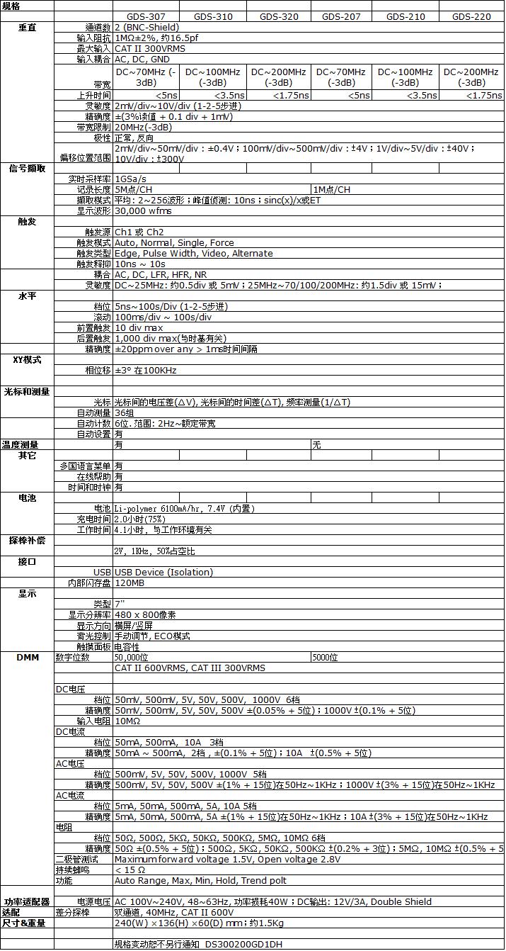 數(shù)字示波器已進入一個全新的時代,精巧的外型,,全頻幕多點觸控操作,豐富的功能使得看似精巧的數(shù)字示波器,卻具備了強大的功能,這足以輕松解決工程師所需要面對繁復的量測問題,這是固緯對全新時代魅力示波器的最新定義,也是它為何稱之為儀器界之霹靂嬌娃的重要原因。U盤儲存功能,可垂直或橫向觀測,亦附帶可充電鋰電池,方便外出使用。在各項任務領域可使用于一般實驗室、研發(fā)服務單位、大型機電系統(tǒng)測試、電源產(chǎn)品量測、馬達測試、太陽能電池檢修以及需要經(jīng)常性出差之維修人員。 GDS-300/GDS-200系列智能示波器具備進階型以及標準型兩系列機種,分別具備70MHz、100MHz以及200MHz三種帶寬選擇,搭載兩通道之模擬信號輸入端。其中單一通道最大取樣率為1GSa/s,存儲器長度最長可達5M/1Mpts。GDS-300/GDS-200示波器同時具備50,000位數(shù)/5,000位數(shù)之數(shù)字萬用表,可同時進行交直流電壓、電流以及溫度之量測與監(jiān)控(溫度測量僅GDS-300),亦可進行長時間趨勢圖型之繪制,讓工程師在量測基本電路信號之外,亦能有效監(jiān)控標準電氣參數(shù)。 此產(chǎn)品亦可搭配40MHz雙通道差分測試探棒,對于一些要求嚴苛的電源以及接地環(huán)境可提供等效之隔離通道效果。使用者亦能將示波器當作是一方便使用的USB儲存元件,可隨時儲存波形影像以及點陣資料。另外還可以與智能型手機連線,將儲存的資料傳輸出去。多樣化的應用軟件可讓使用者體會固緯示波器的貼心設計,其中進階數(shù)字萬用表功能以及GO/NOGO模板之編輯,能幫助使用者進行進階多樣化的功能量測。工程計算機、衰減值計算分析,以及電阻值計算分析軟件可幫助使用者進行輔助功能之應用,多樣化也深具魅力的多功能性呈現(xiàn)了完整的技術整合理念。