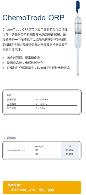 ChemoTrode ORP是可以應(yīng)用在制藥和化工行業(yè)過程中的最耐受苛刻測(cè)量要求的ORP傳感器。該傳感器有一個(gè)加液孔可以添加電解液并可外加壓,,EVEREF-F參比系統(tǒng)確保參比電解液保持無銀離子和蛋白質(zhì)沉淀。