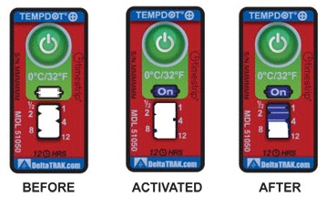 TempDot™Plus標簽應存儲在室溫下,,并必須在反應溫度閾值以上被激活。激活是通過用手指推壓。"On"字出現(xiàn)在第一個窗口中顯示激活。之后5分 鐘內(nèi),,在反應溫度或低于反應溫度的情況下將標簽貼到產(chǎn)品上。藍色染料熔化并以控制的速率遷移,經(jīng)過白色大窗口。這表示暴露在溫度閾值以上的累計時間。當溫 度低于閾值時,,該染料固化并停止移動。如果溫度超過閾值,,TempDot®Plus標簽提供即時的視覺跡象。