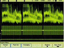 圖2是無Z軸亮度調(diào)制較老數(shù)字示波器的顯示。雖然該示波器甚至在5ms/div時仍有捕獲信號細節(jié)的足夠采樣率和存儲器深度但所有捕獲點的顯示亮度相同。這就在視覺上丟失了信號包絡(luò)內(nèi)的波形細節(jié)。因此在選擇模擬示波器技術(shù)還是選擇較老的數(shù)字顯示技術(shù)上不應(yīng)對今天視頻實驗室中充斥模擬示波器感到驚奇!