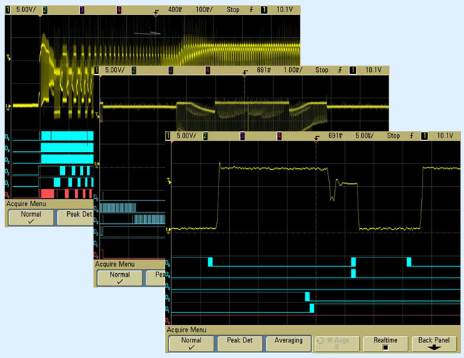 圖5. 由數(shù)字控制信號觸發(fā)的馬達驅(qū)動信號起動序列,以及用Agilent 6000系列MSO不同級別的放大展現(xiàn)“矮”脈沖