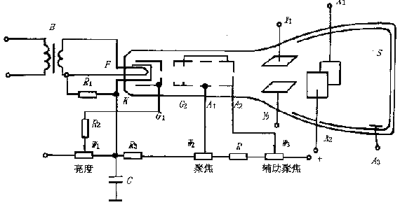 電子槍由燈絲(F)、陰極(K)、柵極(G1)、前加速極(G2)(或稱第二柵極)、第一陽極(A1)和第二陽極(A2)組成。它的作用是發(fā)射電子并形成很細(xì)的高速電子束。燈絲通電加熱陰極陰極受熱發(fā)射電子。柵極是一個(gè)頂部有小孔的金屬園筒套在陰極外面。由于柵極電位比陰極低對陰極發(fā)射的電子起控制作用一般只有運(yùn)動(dòng)初速度大的少量電子在陽極電壓的作用下能穿過柵極小孔奔向熒光屏。初速度小的電子仍返回陰極。如果柵極電位過低則全部電子返回陰極即管子截止。調(diào)節(jié)電路中的W1電位器可以改變柵極電位控制射向熒光屏的電子流密度從而達(dá)到調(diào)節(jié)亮點(diǎn)的輝度。第一陽極、第二陽極和前加速極都是與陰極在同一條軸線上的三個(gè)金屬圓筒。前加速極G2與A2相連所加電位比A1高。G2的正電位對陰極電子奔向熒光屏起加速作用。