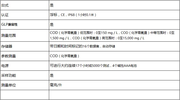 主要技術(shù)指標(biāo):一款堅(jiān)固耐用的防水型單參數(shù)測(cè)量?jī)x器,用于測(cè)量COD(化學(xué)需氧量)